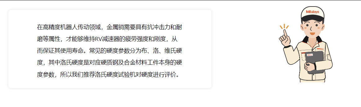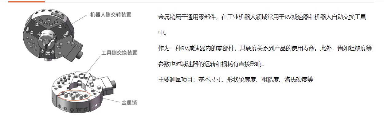 金属销属于通用零部件,在工业机器人领域常用于RV减速器和机器人自动交换工具中。 作为一种RV减速器内的零部件,其硬度关系到产品的使用寿命。此外,诸如粗糙度等参数也对减速器的运转和损耗有直接影响。 主要测量项目:基本尺寸、形状轮廓度、粗糙度、洛氏硬度等